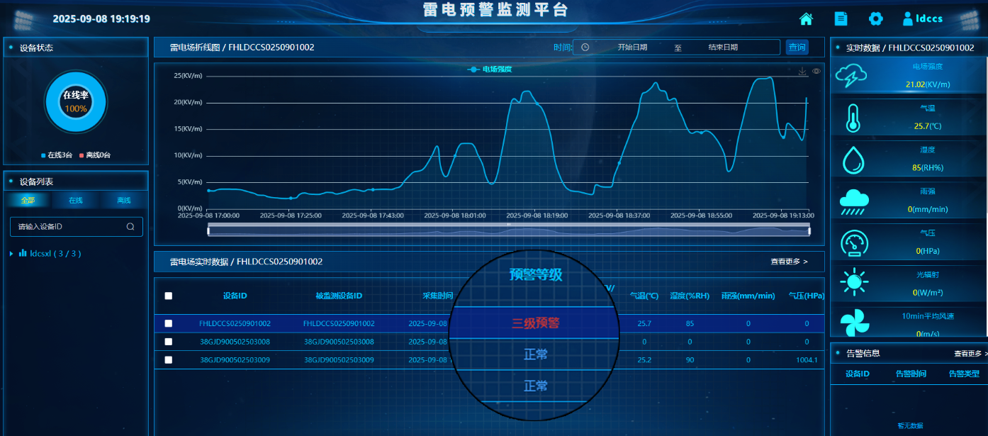 此次安装的雷电预警系统可实现对监测范围内雷电活动的实时监测,提前捕捉雷电生成及移动趋势。系统具备自动化报警功能,能够通过声光、短信等多种方式及时发布预警,协助工作人员提前做好应急防护准备,提升安全管理效率。
